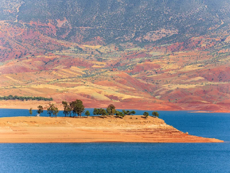 The impressive Bin El Ouidane Dam sits just 28 kilometers south of Beni Mellal. Built between 1949 and 1953, this engineering marvel created a 15,000-acre reservoir with striking red clay banks and mountain views. Clear waters make the lake perfect for fishing, boating, and kayaking. Visitors can escape city life here and stay in lakefront accommodations to enjoy more their Morocco trip.