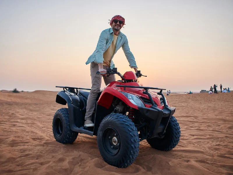 Quad biking offers a more independent and hands-on way to explore Dubai’s desert landscape. Riders operate an all-terrain vehicle (ATV) designed to handle rough sand conditions, giving them the freedom to navigate open trails and smaller dunes. Safety gear and basic training are provided before the ride, making it suitable for both beginners and experienced riders. This activity combines the thrill of speed with the beauty of the desert, making it one of the most popular add-ons to safari packages.