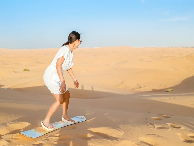 Sandboarding is a unique desert sport that resembles snowboarding but takes place on fine golden sand instead of snow. Participants glide down the slopes of tall dunes using specially designed boards, experiencing both excitement and a sense of freedom. It’s a safe and fun activity that doesn’t require prior experience — making it perfect for travelers of all ages. Many desert safari tours include sandboarding sessions as part of the adventure, offering a perfect mix of fun, balance, and unforgettable desert scenery.