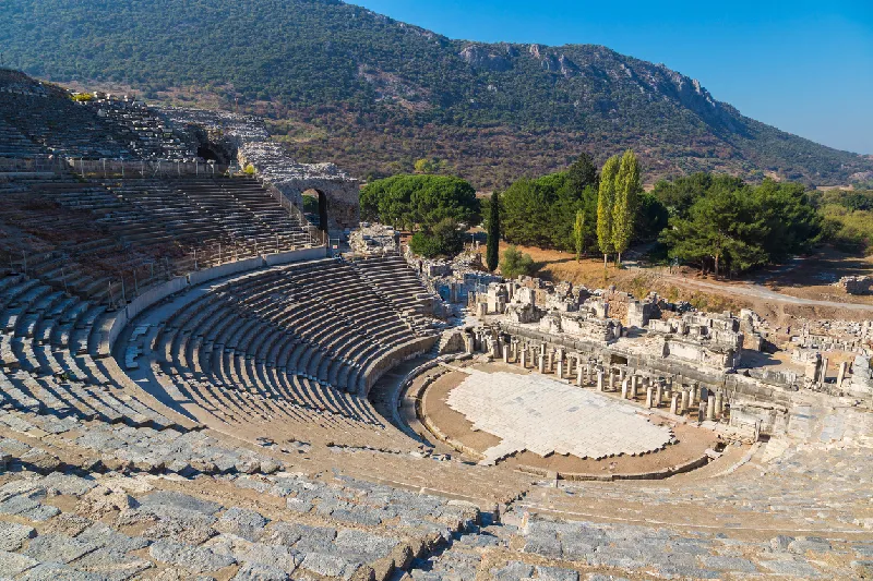 The Great Theater sits on Panayir Mountain's slope and shows extraordinary ancient engineering. The Hellenistic period (3rd century BCE) saw its initial construction. The Romans expanded it later. This massive structure held about 25,000 spectators in 66 rows of seats. Three horizontal walkways split these rows into sections. The theater's amazing acoustics let people in the last row hear even whispers from the stage.