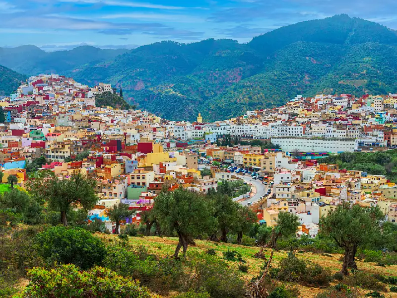 Moulay Idriss Zerhoun sits just 5 kilometers from Volubilis. The town's name honors Prophet Muhammad's great-grandson who brought Islam to Morocco in 789 AD. The town spreads across two hills and features Morocco's only cylindrical minaret that crowns the Sentissi Mosque. Visitors can stroll through pastel-colored streets and take in spectacular views from hillside terraces.