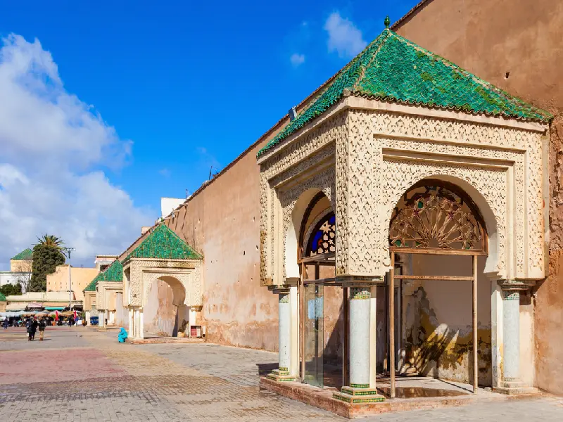 The city features many important mosques, including Lalla Aouda, Er Rouah, and Zitouna. The historic Grand Mosque stands out in the medina with its green-tiled roof. You can visit the Mausoleum of Moulay Ismail to see its beautiful mosaic decorations, but not on Friday mornings.